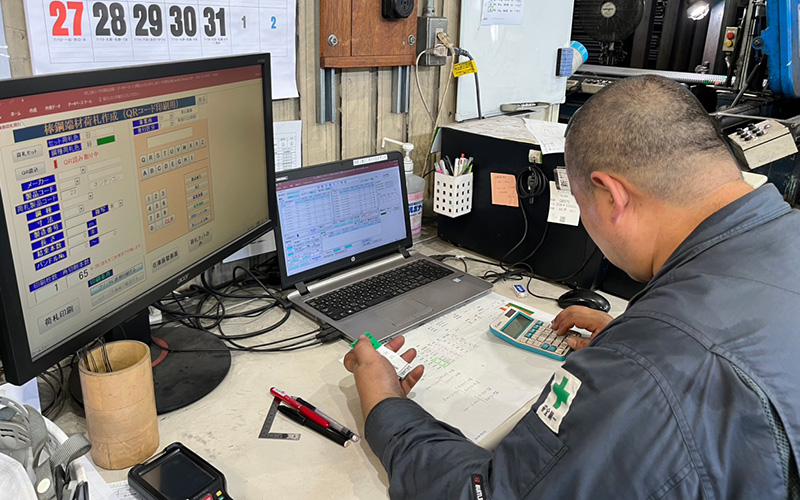 主に精密切断機を操作し、お客様のご要望の長さに鉄筋を切断しています。また、定尺鉄筋を無駄なく、効率良く切断出来るように、長さを取り合わせ精密切断機に間違えがないよう長さを入力して操作しています。切断後、ご要望があれば鉄筋を曲げていきます。